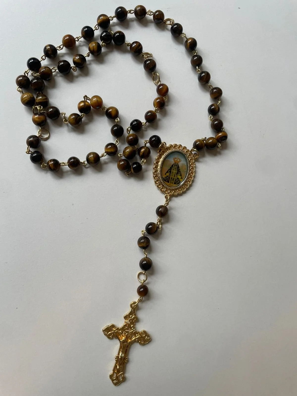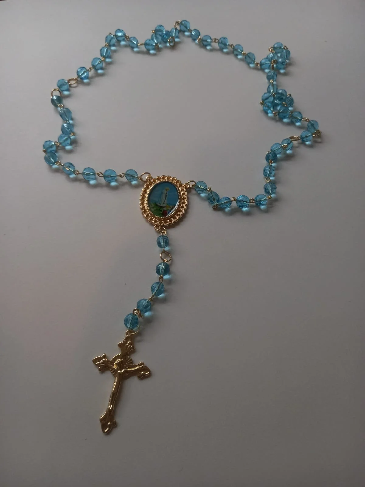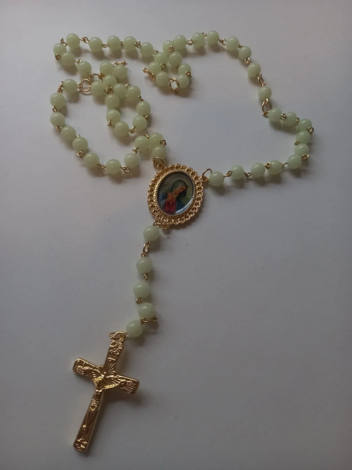 Este terço brilha no escuro, eu rezo de madrugada então é fácil achá-lo.